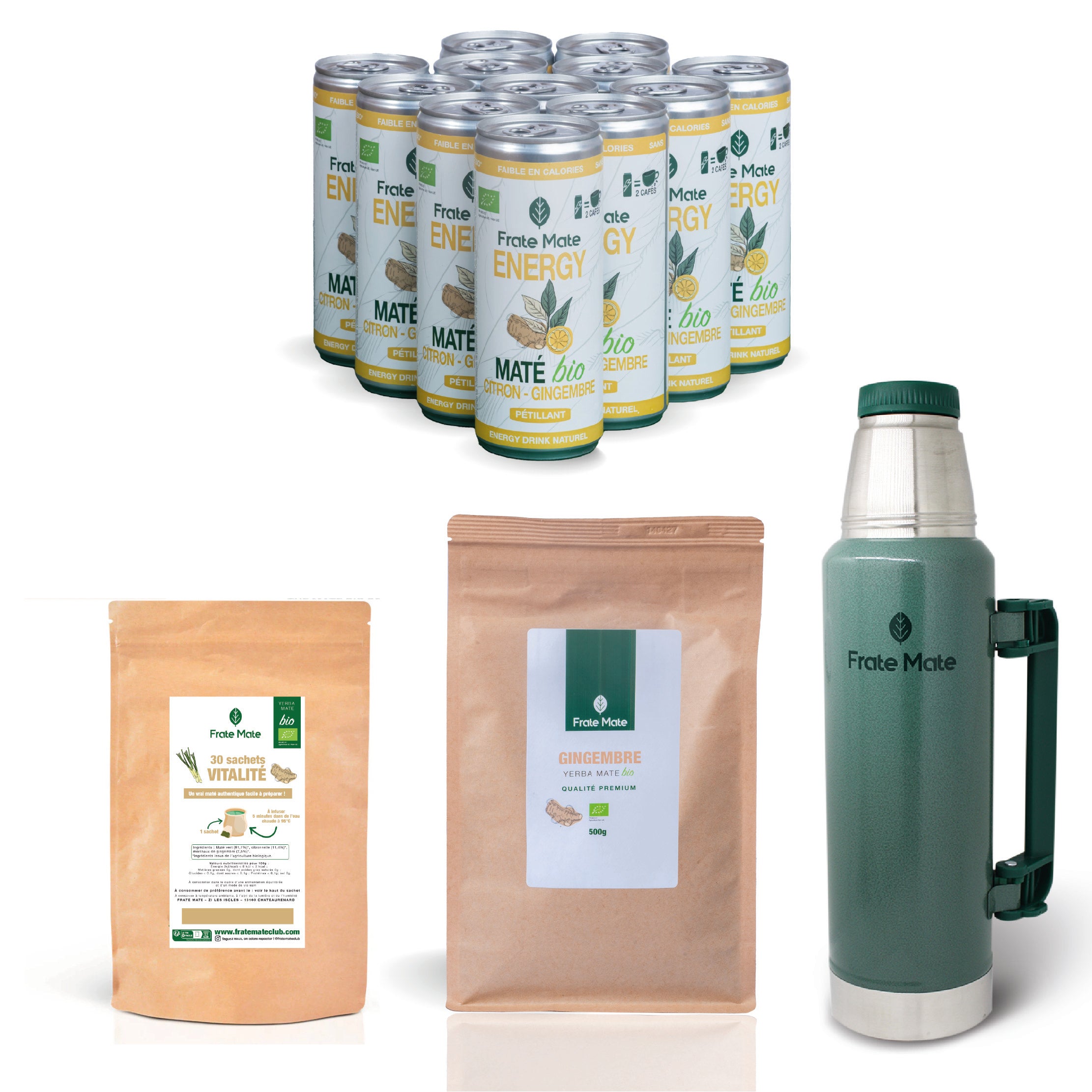 Coffret Ginger – Maté Gingembre Bio, Canettes Citron-Gingembre, Thé Maté Vitalité & Thermos