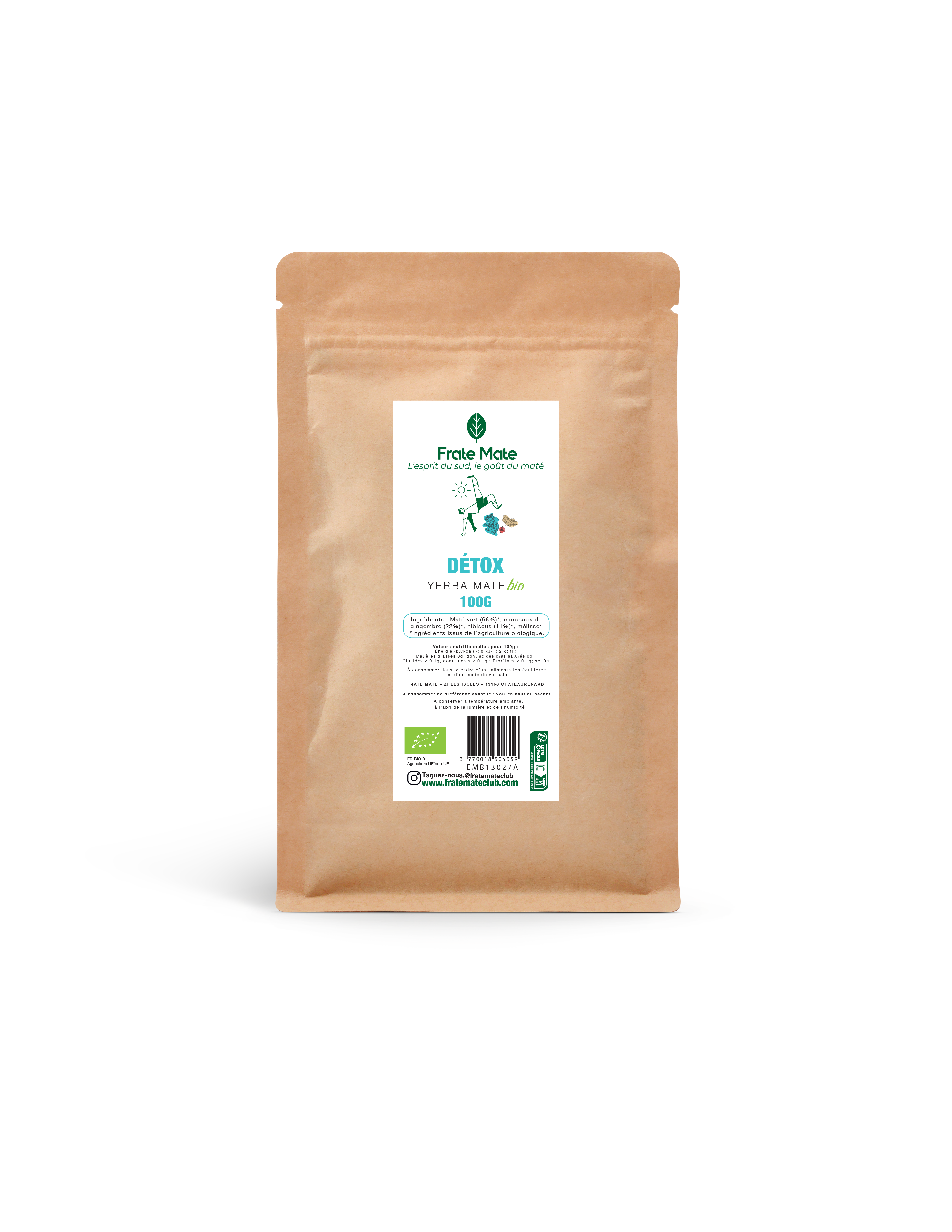 Découvre le Maté Détox Bio Fraté Maté, une création équilibrée mêlant la richesse de la yerba maté à un subtil assemblage de plantes aromatiques.