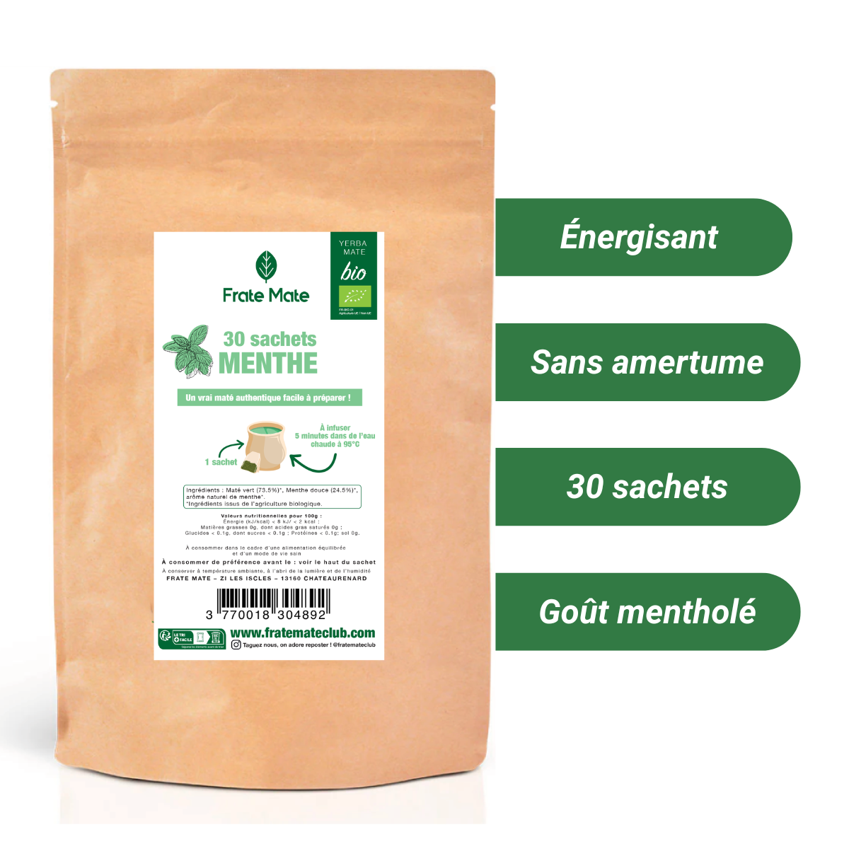 Maté Menthe (30 sachets) – Rafraîchissant et apaisant, parfait pour la récupération ou une pause bien-être.